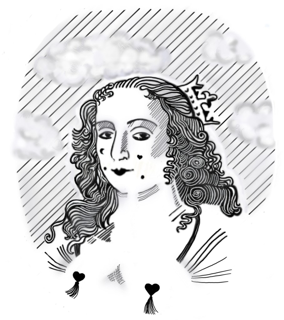 Her desire to be ‘singular’ manifested in remarkable means – by day she dressed in men’s clothing, by night she was seen wearing scarlet nipple tassels, her face littered with black velvet patches to hide her acne-scarred skin. She travelled in a solid silver coach with monochrome interior, reputedly pulled by eight white bulls. Margaret Cavendish used her celebrity to promote her extensive creative output in a male dominated arena.